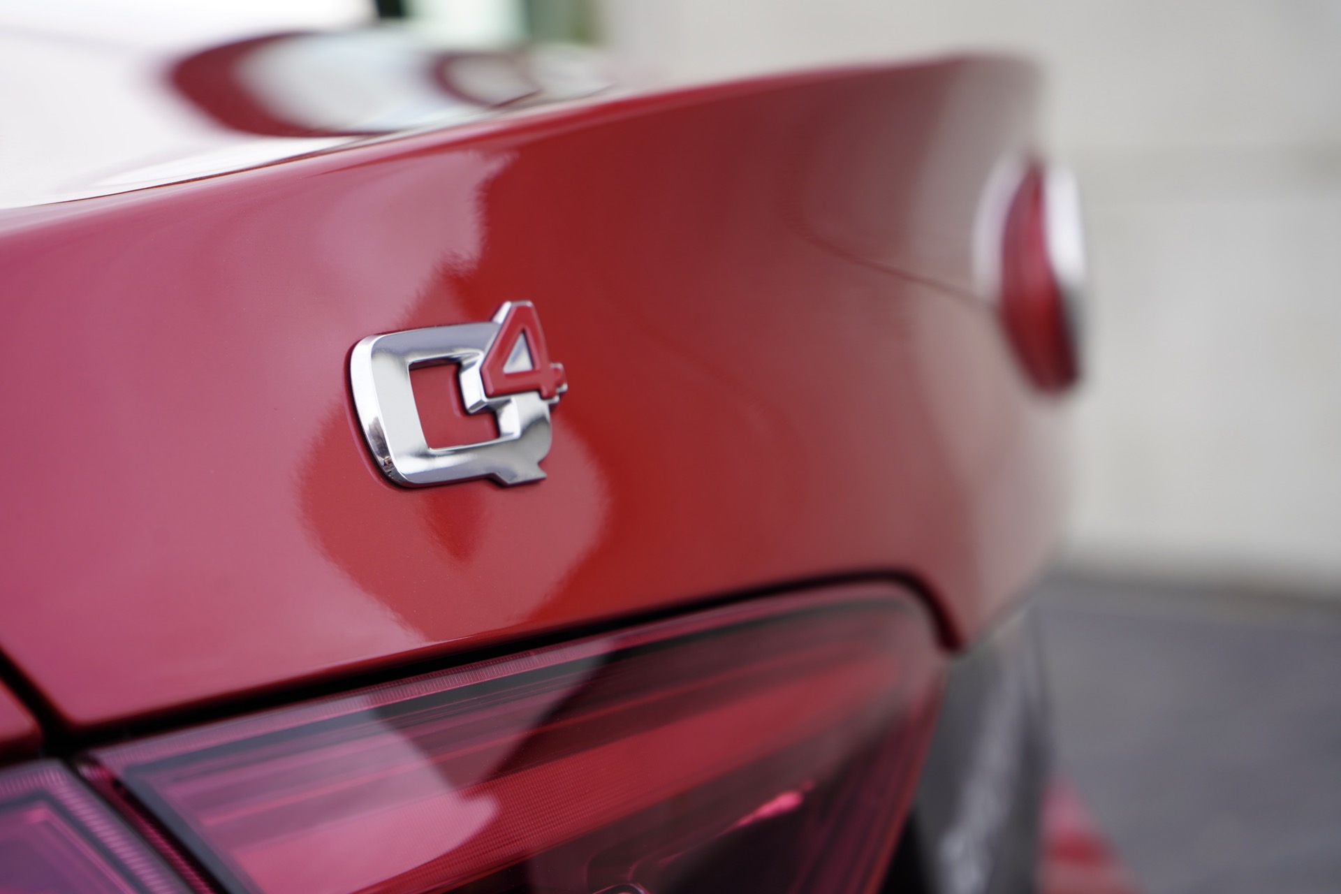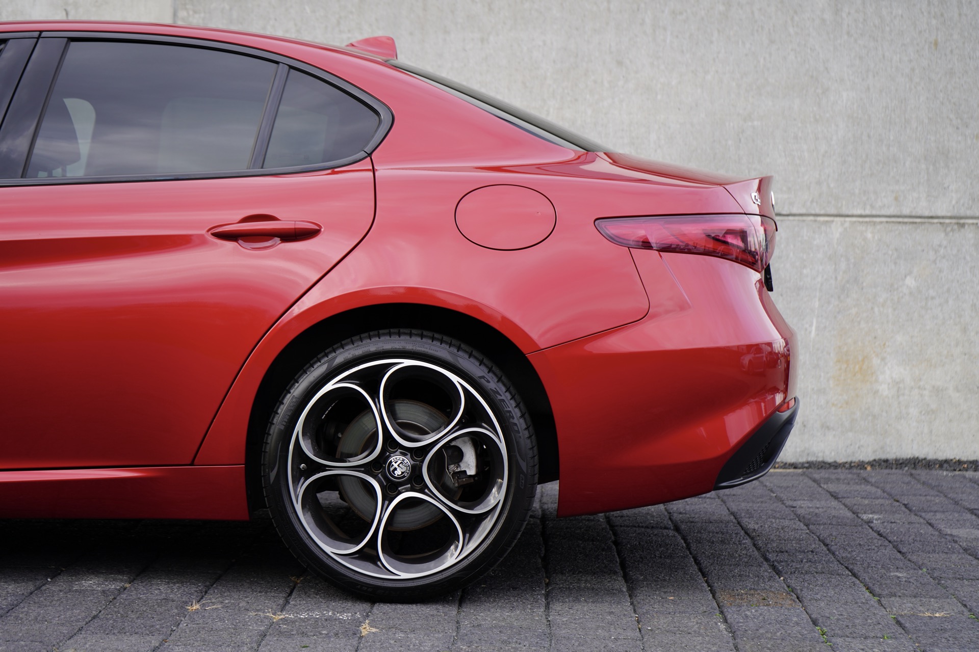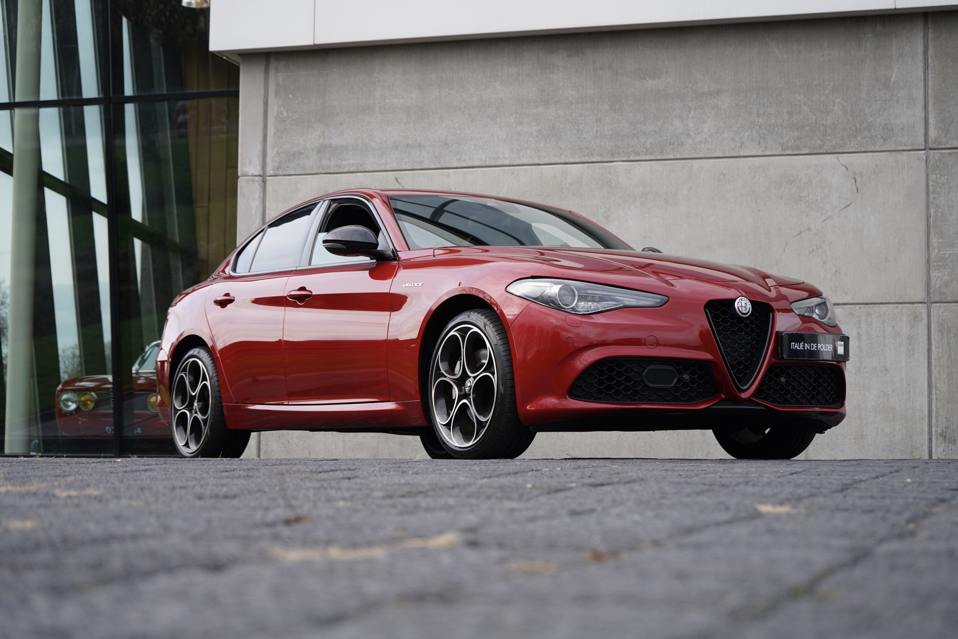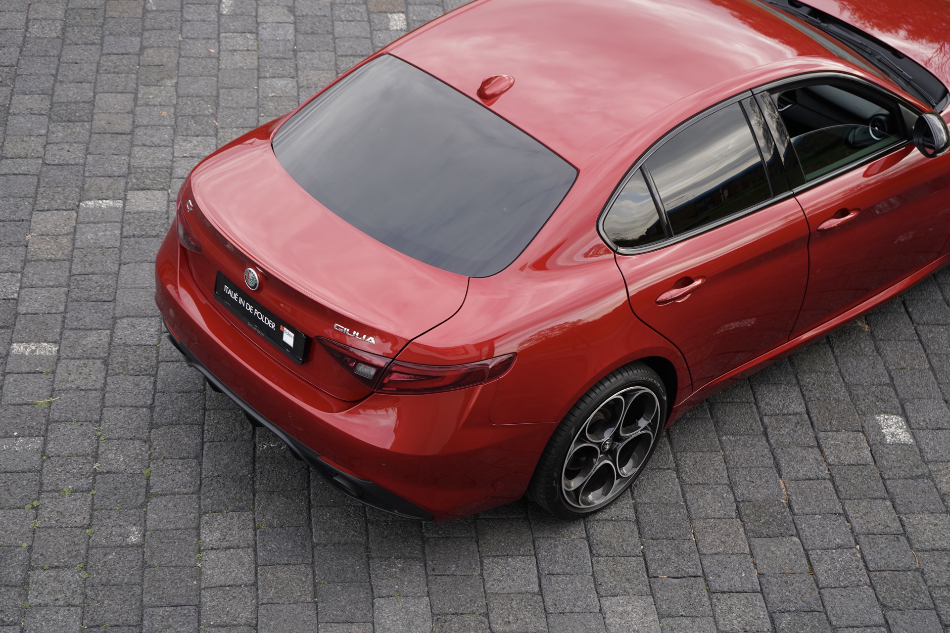 Prachtige Giulia Veloce Q4 uit 2022 in Rosso '8C' Competizione... Een prachtig exemplaar met zwart lederen sportstoelen, donkere interieur afwerking en privacy glass. In super mooie staat, en voorzien van keyless entry, adaptive cruise control, stuurwiel verwarming en het brede 8,8 inch navigatie display met Apple CarPlay en Android auto.