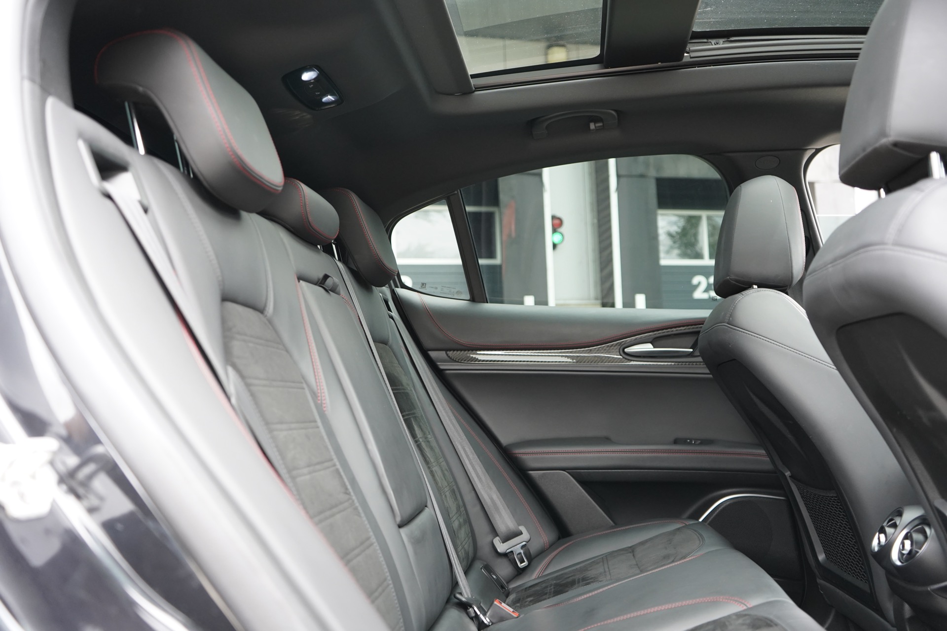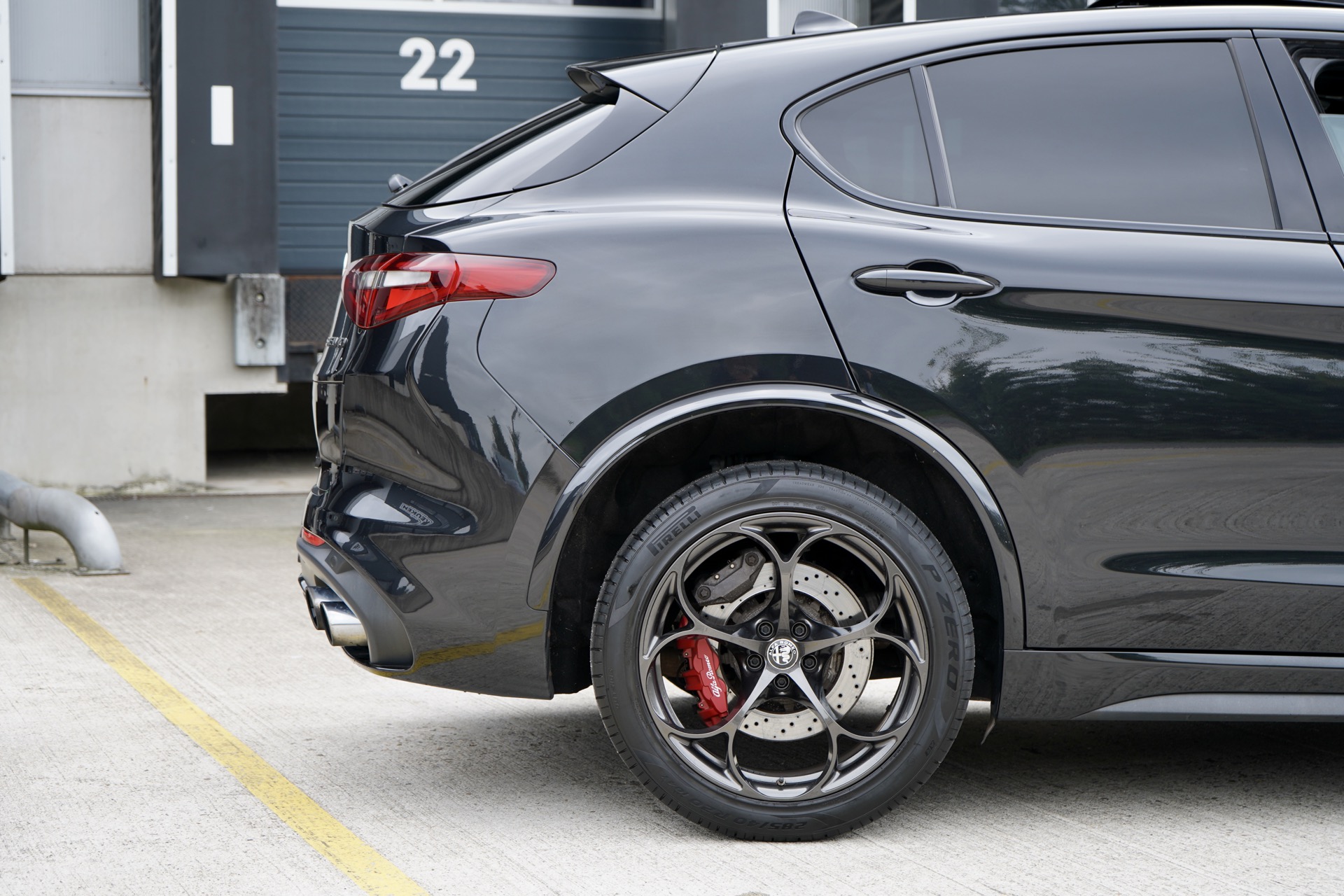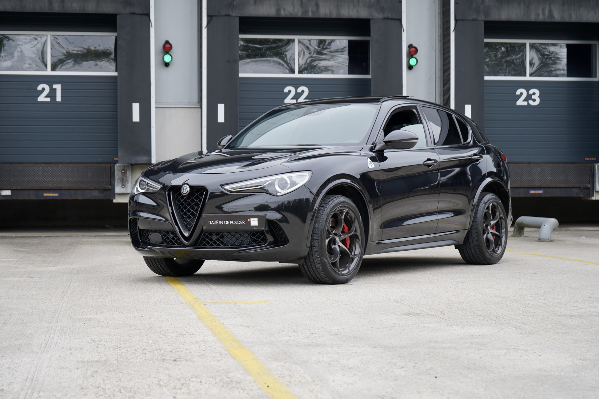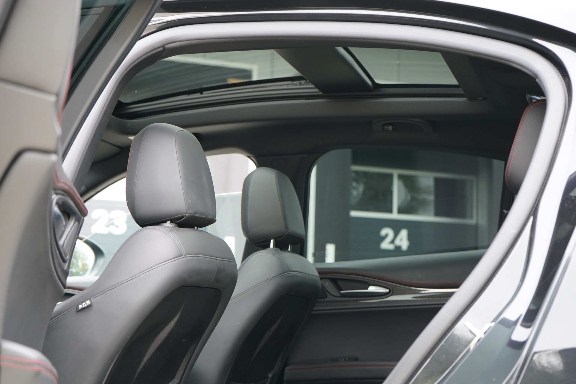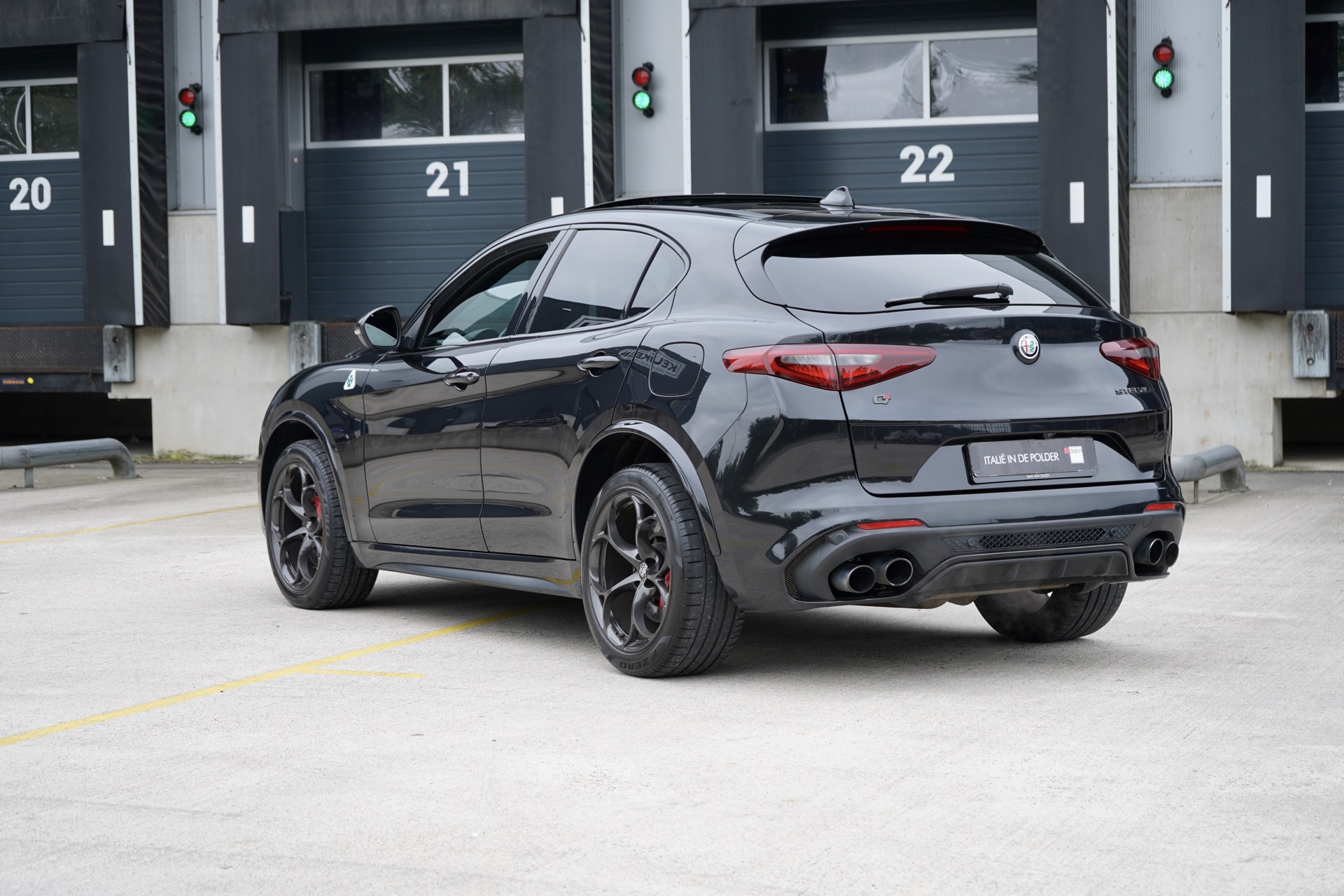 Prachtige Alfa Romeo Stelvio Quadrifoglio uit 2018 in Nero metallico met het mooie grote glazen schuifdak en rode stiksels in het interieur. Voorzien van Harman Kardon Audio systeem voor een perfect muziekgeluid, rode remklauwen, Privacy Glass vanaf de B-stijl, stuurwiel verwarming en stoelverwarming en het mooie 8,8 inch navigatie display met achteruit rij camera. Daarnaast is ze ook nog voorzien van Apple CarPlay en Android Auto.