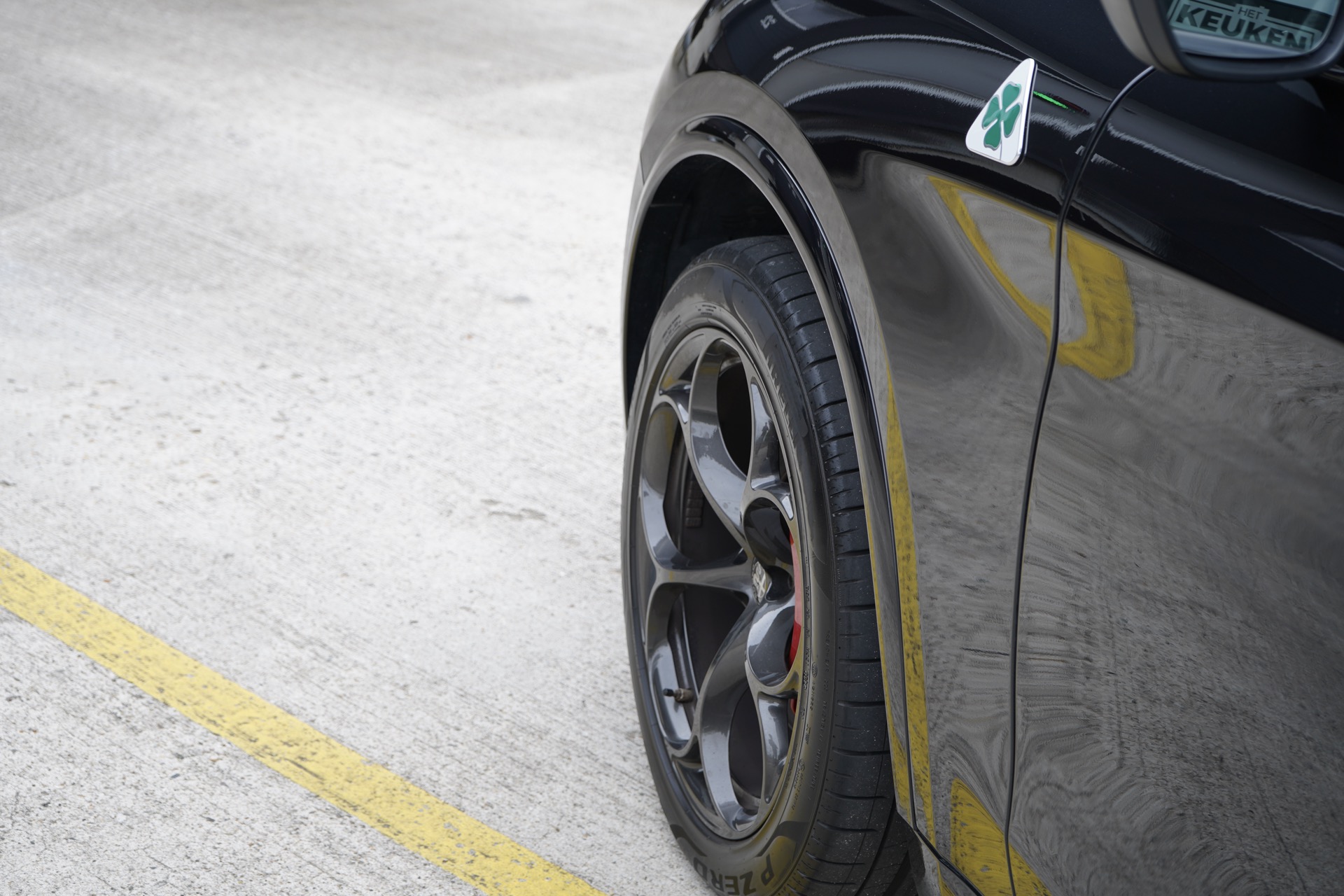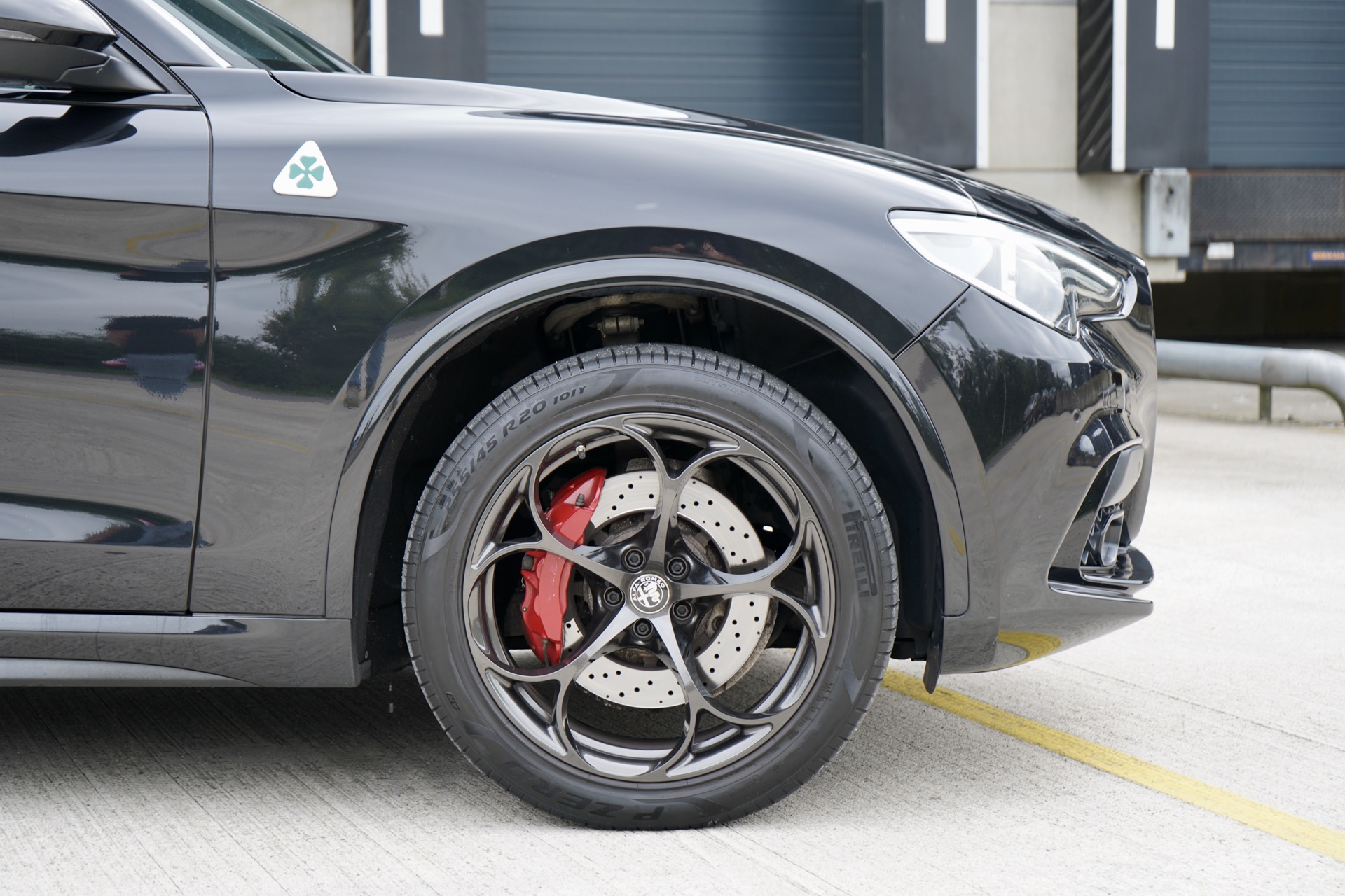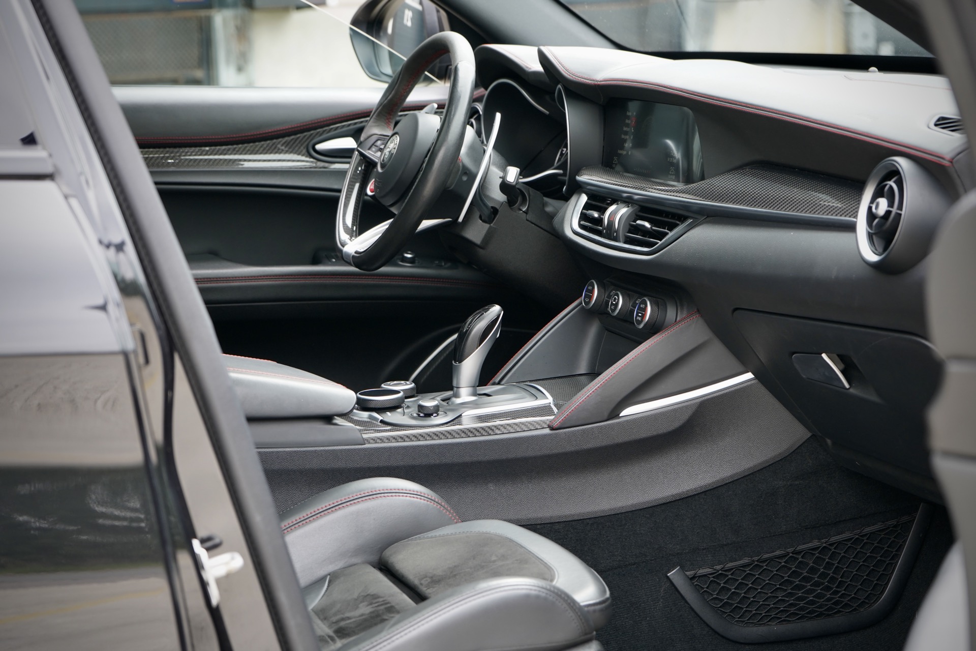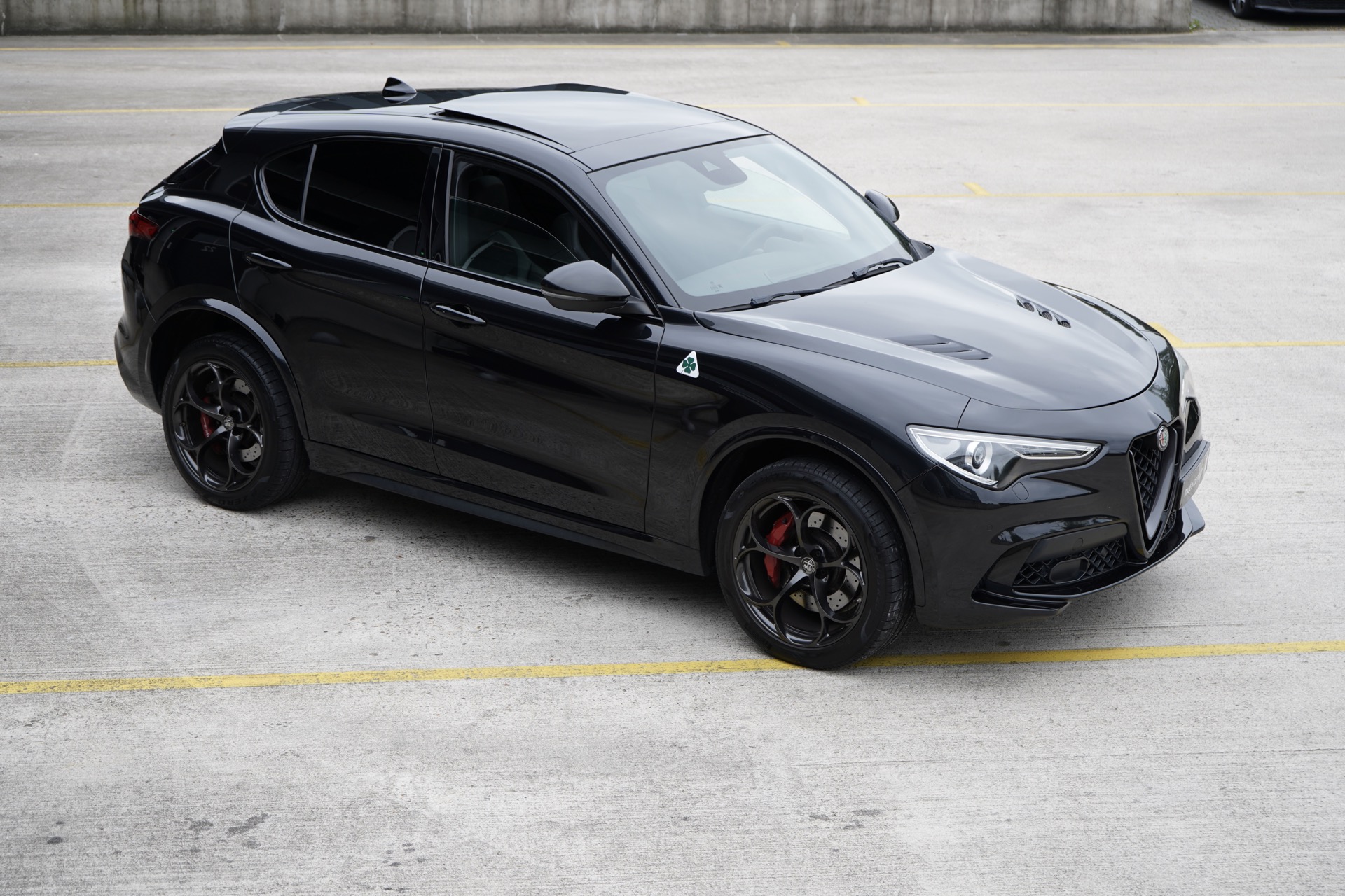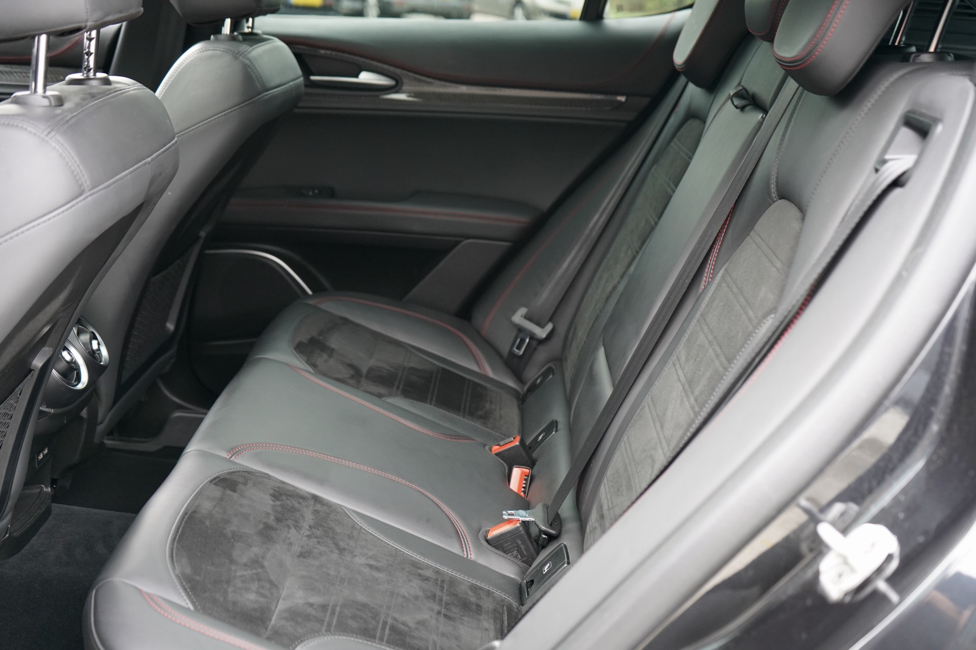 Prachtige Alfa Romeo Stelvio Quadrifoglio uit 2018 in Nero metallico met het mooie grote glazen schuifdak en rode stiksels in het interieur. Voorzien van Harman Kardon Audio systeem voor een perfect muziekgeluid, rode remklauwen, Privacy Glass vanaf de B-stijl, stuurwiel verwarming en stoelverwarming en het mooie 8,8 inch navigatie display met achteruit rij camera. Daarnaast is ze ook nog voorzien van Apple CarPlay en Android Auto.