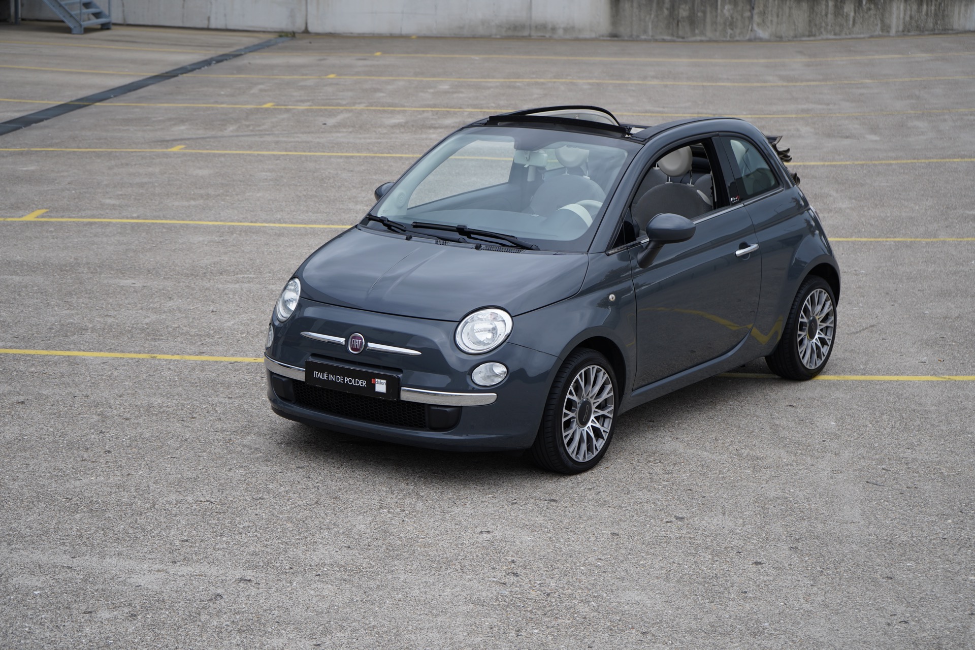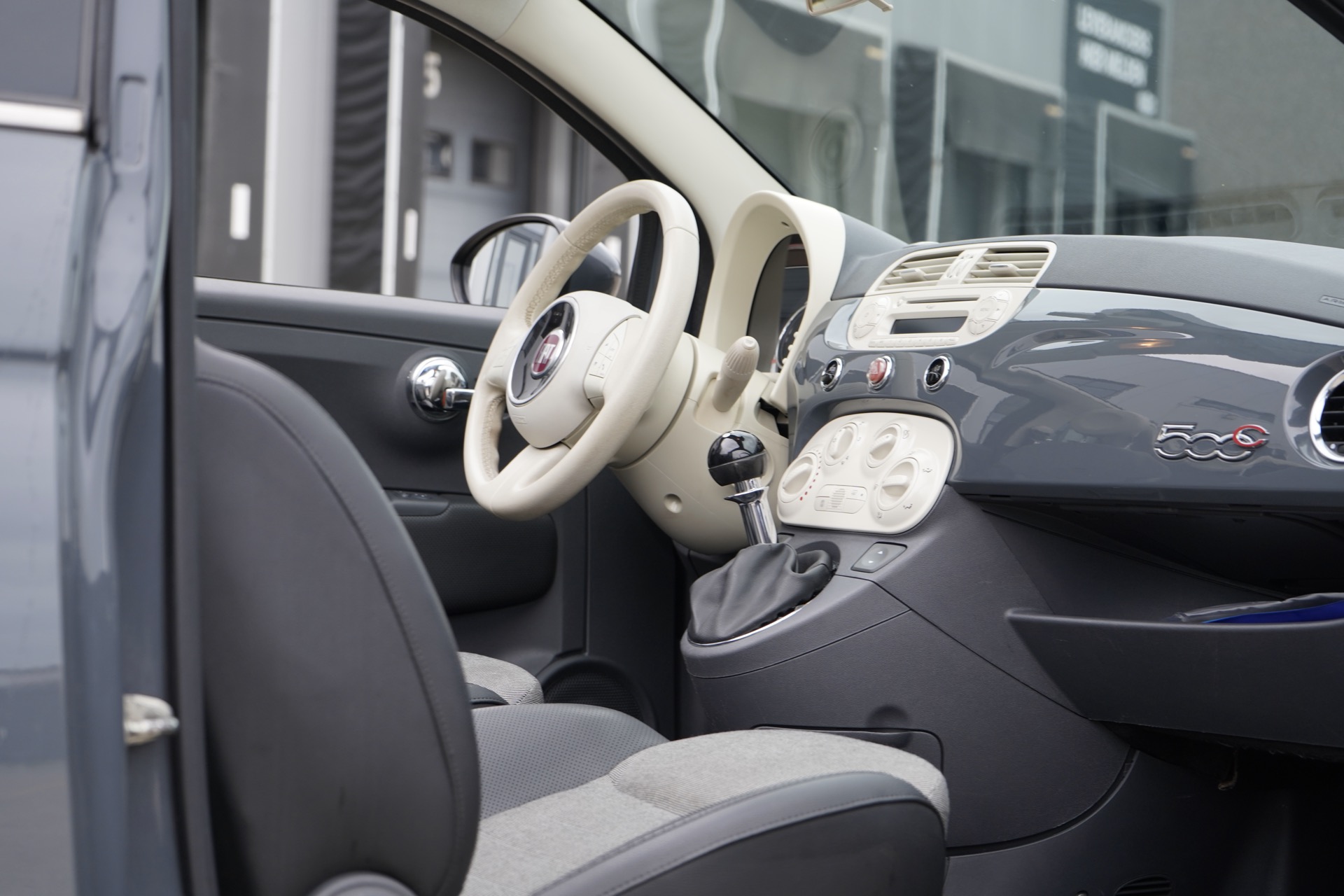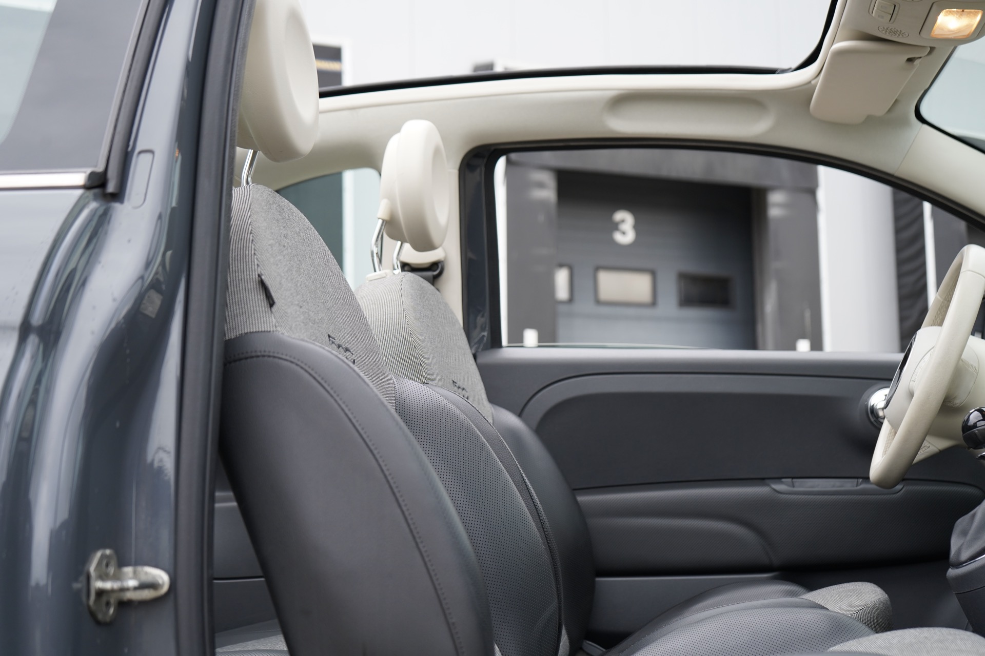 Supermooie Fiat 500C Cabriolet in de Lounge uitvoering! In Grigio Carrara met een beige kap, sportstoelen in leder-stof en de mooie 16inch gepolijste velgen. Perfect onderhouden en slechts 87.000km gereden.